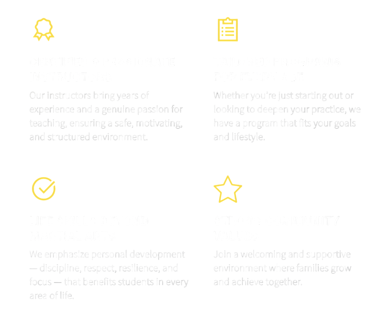 We train not just the body, but the mind and spirit. Through consistent practice, guided instruction, and a supportive community, our students learn to set goals, face challenges with confidence, and live with intention. Whether you’re 4 or 40 or more, the values we teach — respect, perseverance, focus, and humility — become tools for life.